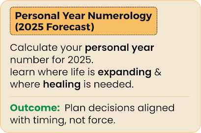 Your strengths. Your hidden challenges. Your lucky vibrations. Everything decoded in a simple, practical way.